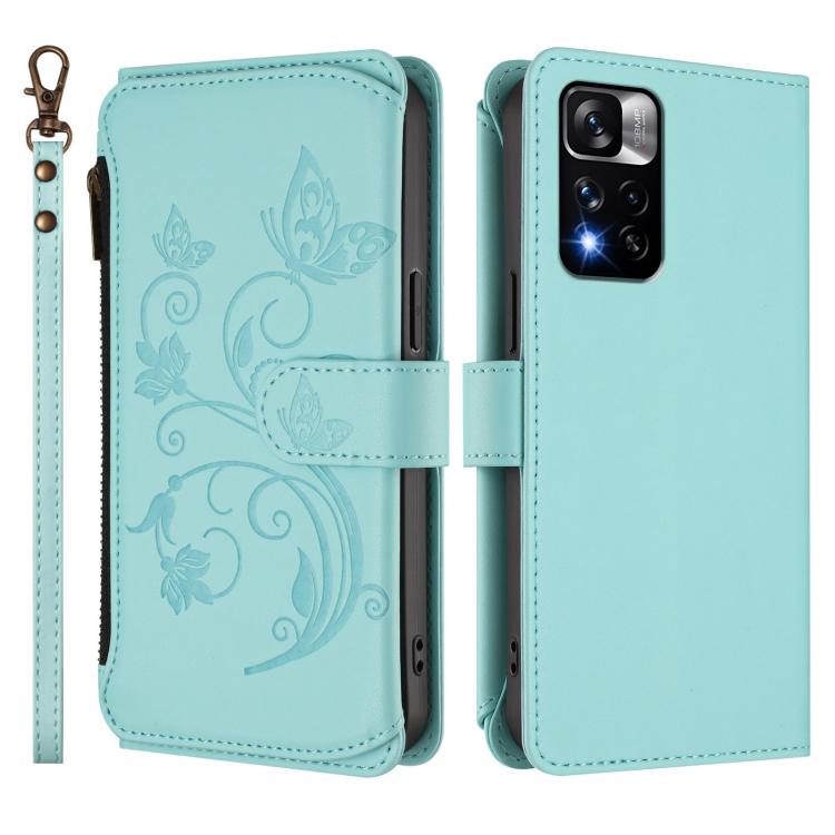 Funda de cuero con cremallera para Redmi Note 11 Pro+ 5G y Xiaomi Poco X4 NFC, diseño de mariposas, flores y múltiples tarjetas (verde menta)