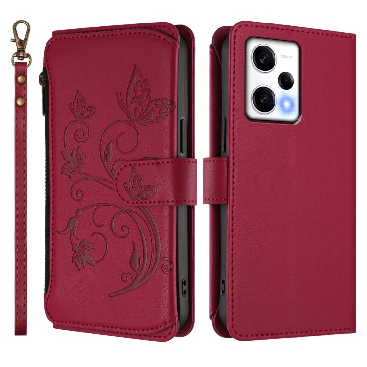 Funda de cuero con cremallera para Redmi Note 12 Pro 5G Global/Speed Butterfly Love Flower, con múltiples tarjetas (rojo vino)