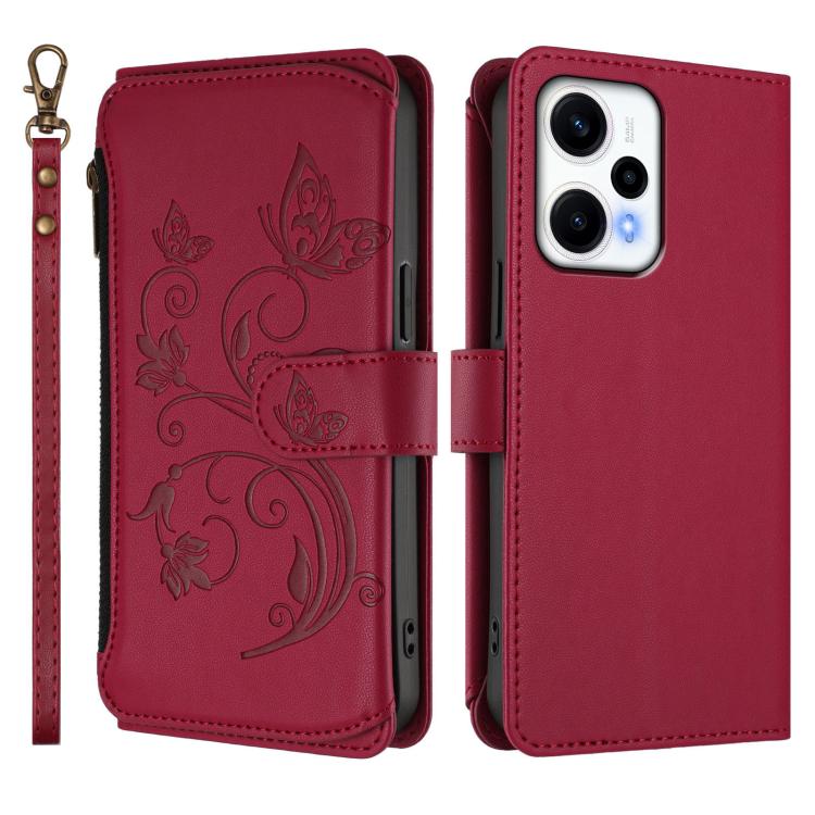 Funda de cuero con cremallera para Redmi Note 12 Turbo / Xiaomi Poco F5, diseño de mariposas, flores y mariposas (rojo vino)