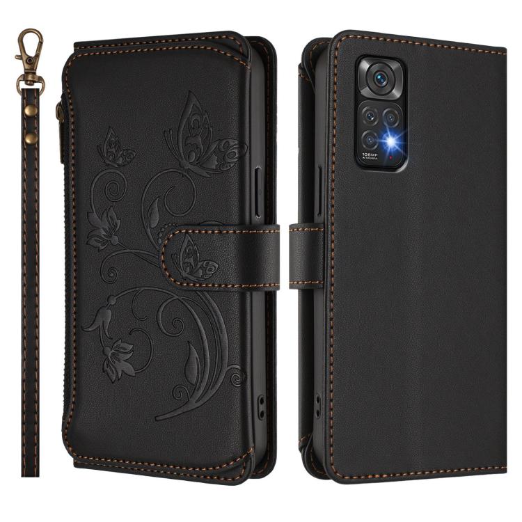 Funda de cuero con cremallera para Redmi Note 12S / Redmi Note 11S 4G, diseño de mariposas, flores y múltiples tarjetas (negro)