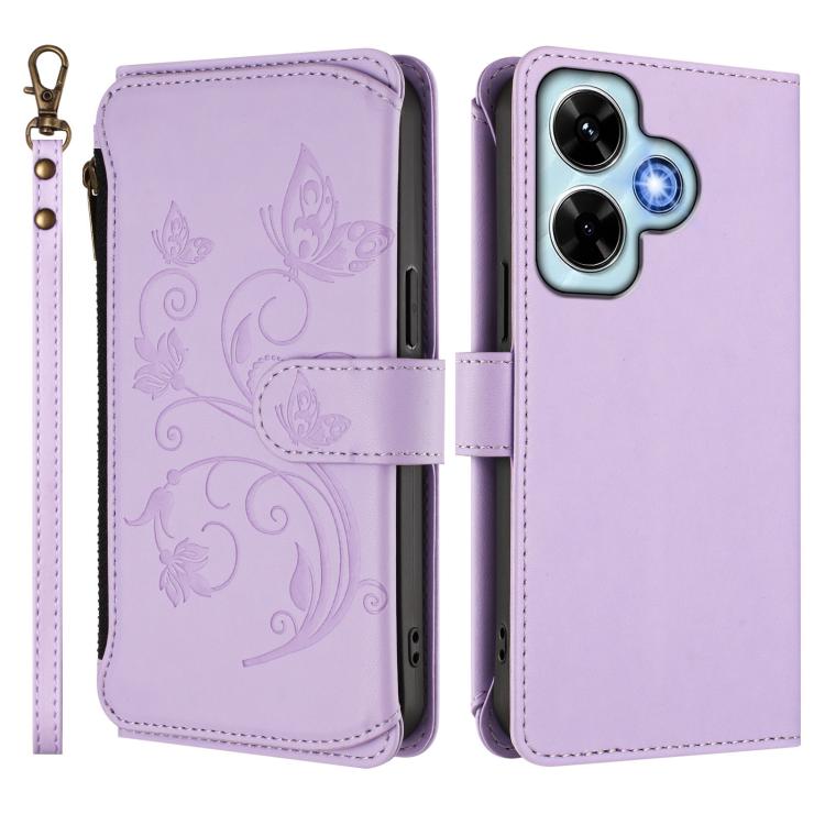 Funda de cuero con cremallera para Redmi Note 13 4G, diseño de mariposas, flores y múltiples tarjetas (morado claro)