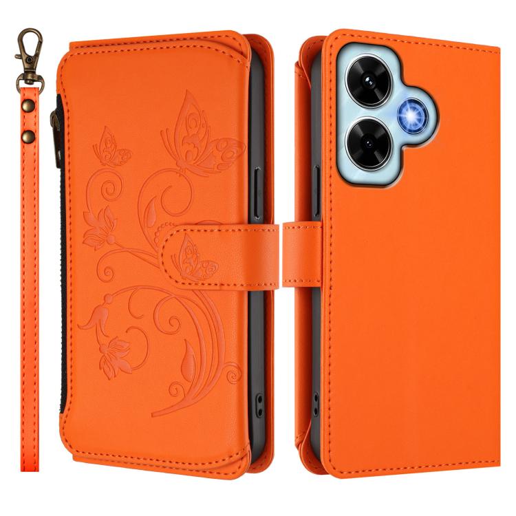 Funda de cuero con cremallera para Redmi Note 13 4G, diseño de mariposas, flores y múltiples tarjetas (naranja)