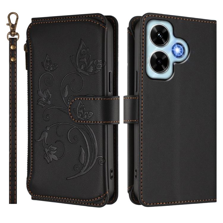 Funda de cuero con cremallera para Redmi Note 13 4G, diseño de mariposas, flores y múltiples tarjetas (negro)