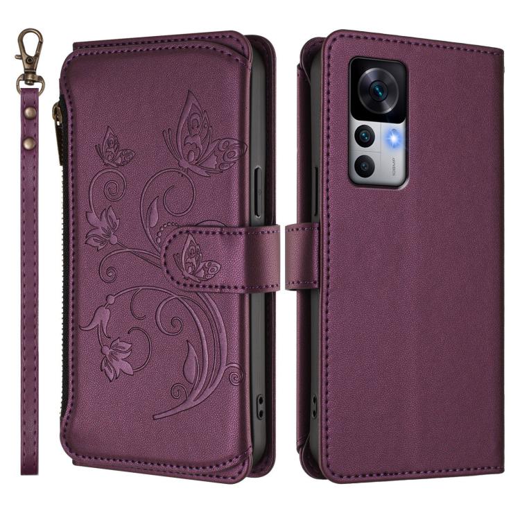 Funda de cuero con cremallera para Xiaomi 12T / 12T Pro / Redmi K50 Ultra, diseño de mariposas, flores y amor (morado oscuro)