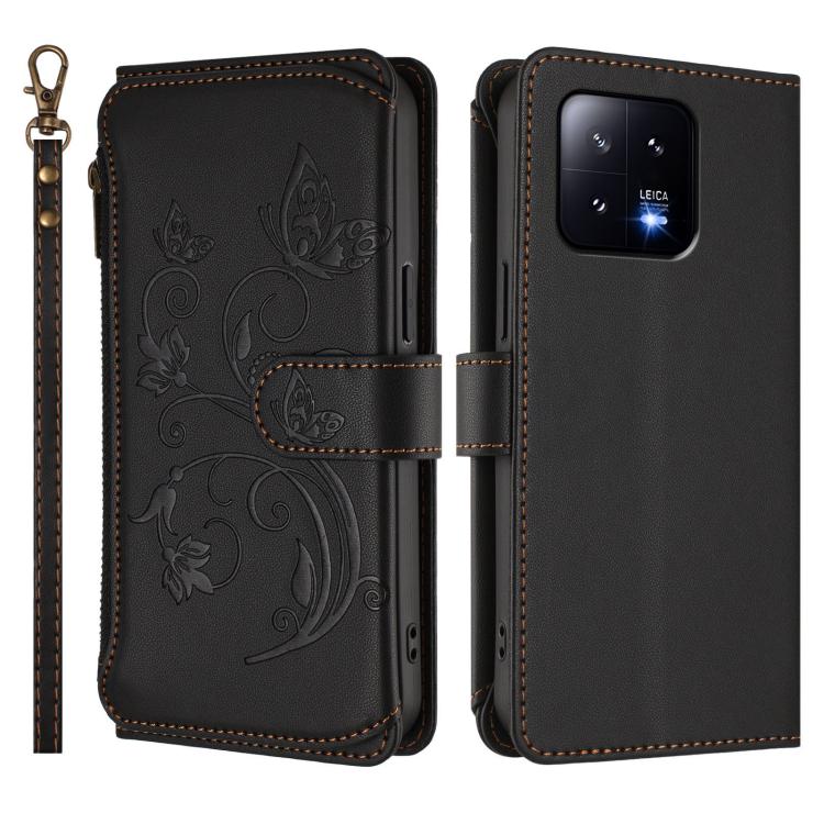 Funda de cuero con cremallera para Xiaomi 13, diseño de mariposas y flores, con múltiples tarjetas (negro)