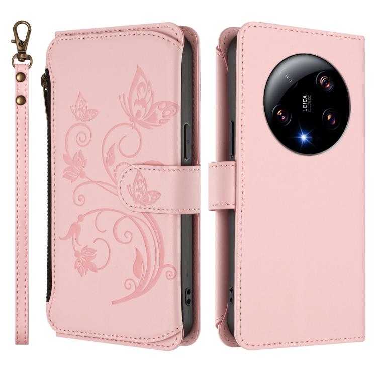Funda de cuero con cremallera para Xiaomi 13 Ultra, diseño de mariposas, flores y mariposas (rosa)