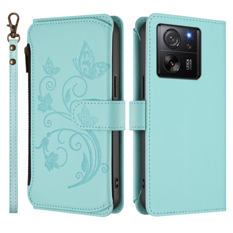 Funda de cuero con cremallera para Xiaomi 13T / 13T Pro / Redmi K60 Ultra, diseño de mariposas, flores y mariposas (verde menta)
