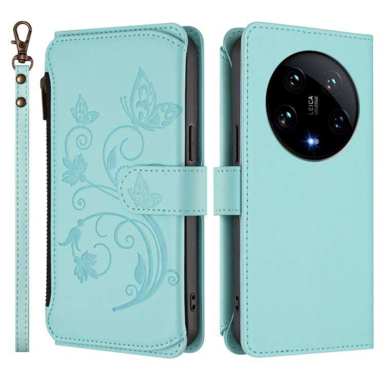 Funda de cuero con cremallera para Xiaomi 14 Ultra, diseño de mariposas y flores, con múltiples tarjetas (verde menta)