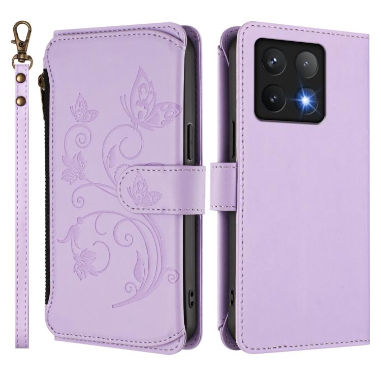 Funda de cuero con cremallera para Xiaomi 14T, diseño de mariposas y flores, con múltiples tarjetas (morado claro)