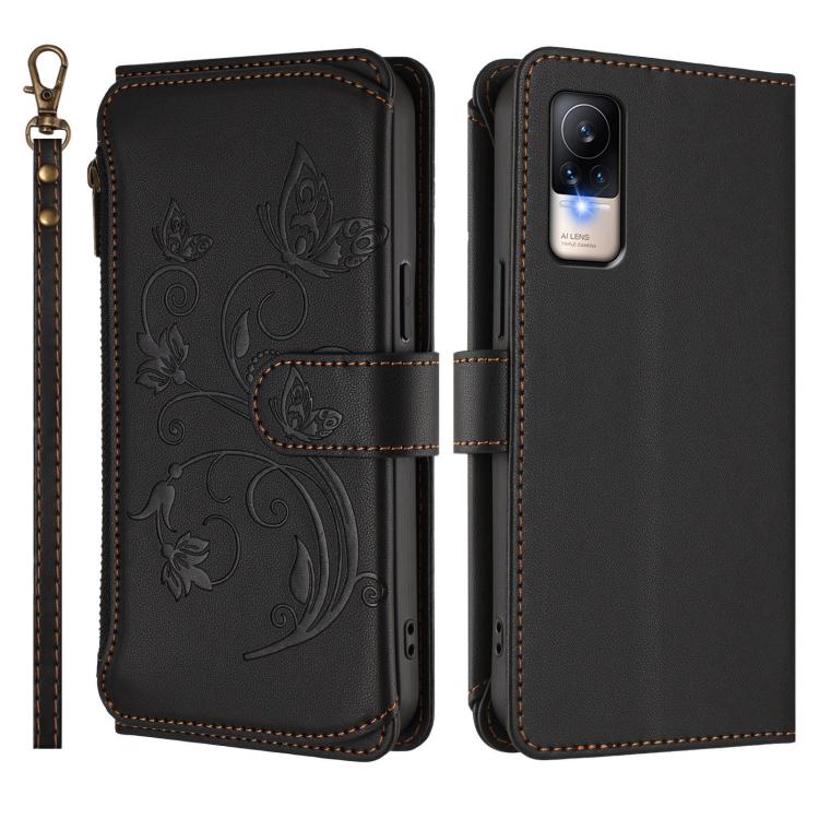 Funda de cuero con cremallera para Xiaomi Civi 1S, diseño de mariposas, flores y múltiples tarjetas (negro)