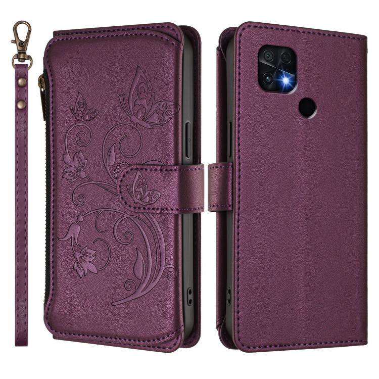 Funda de cuero con cremallera para Xiaomi Poco C40/Redmi 10C, diseño de mariposas, flores y mariposas (morado oscuro)