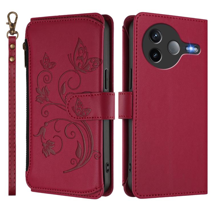 Funda de cuero con cremallera para Xiaomi Poco F7 Pro / Redmi K80, diseño de mariposas, flores y mariposas (rojo vino)