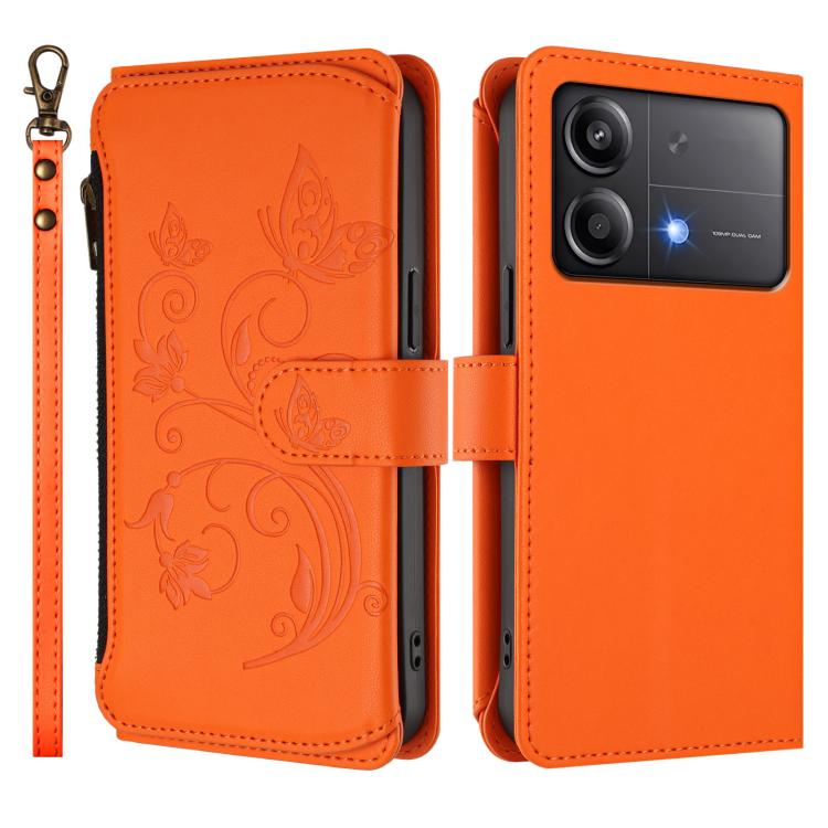 Funda de cuero con cremallera para Xiaomi Poco X6 Neo, diseño de mariposas, flores y amor, con múltiples tarjetas (naranja)