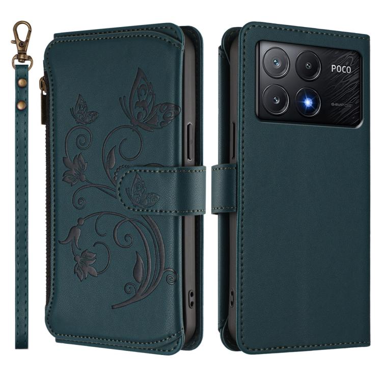 Funda de cuero con cremallera para Xiaomi Poco X6 Pro, diseño de mariposas, flores y mariposas (verde oscuro)
