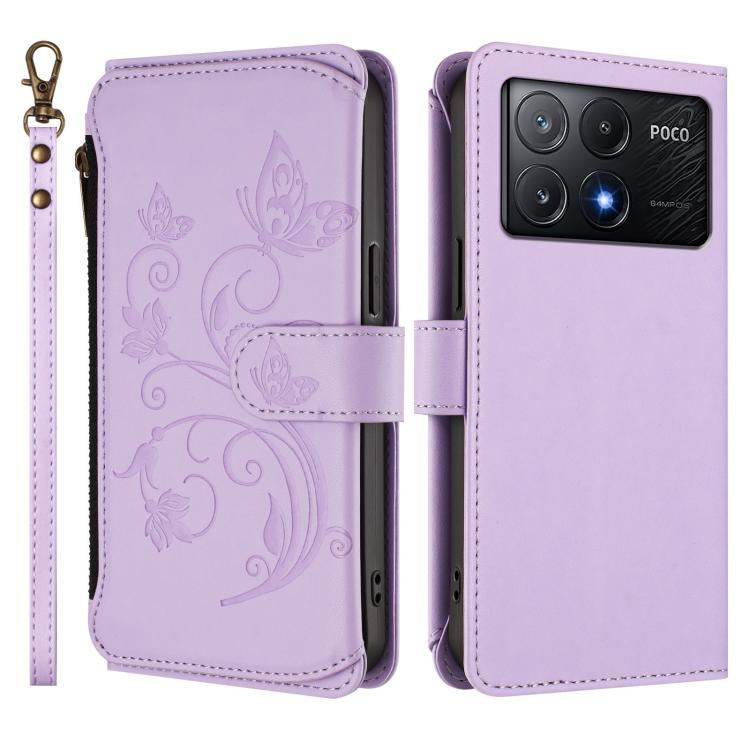 Funda de cuero con cremallera para Xiaomi Poco X6 Pro, diseño de mariposas, flores y múltiples tarjetas (morado claro)