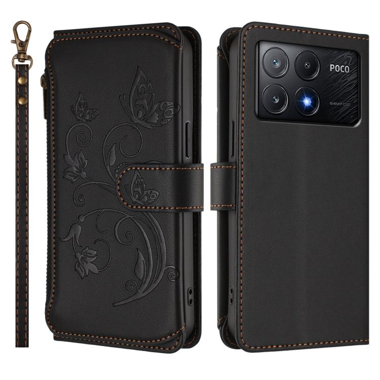 Funda de cuero con cremallera para Xiaomi Poco X6 Pro, diseño de mariposas, flores y múltiples tarjetas (negro)