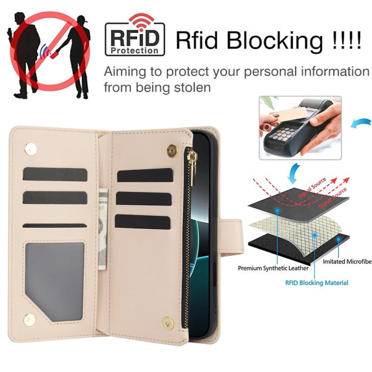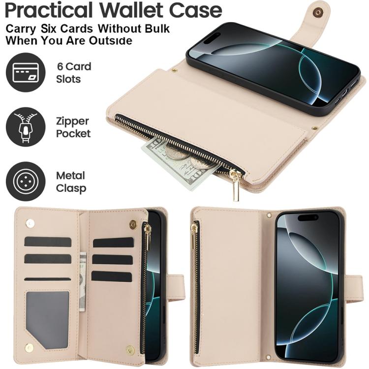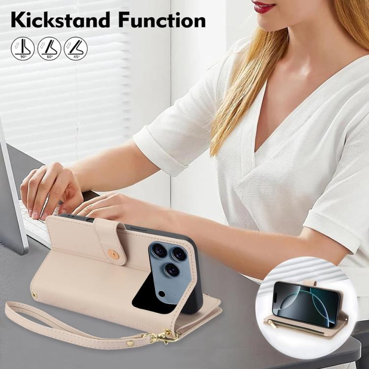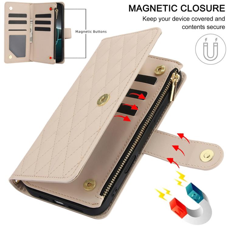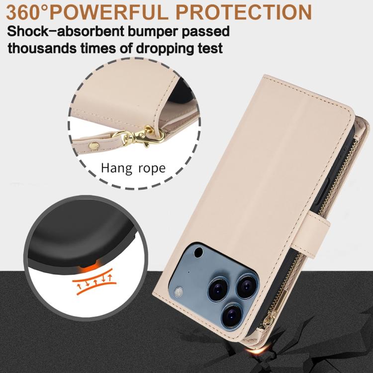 Funda de cuero con cremallera rómbica para iPhone 17 Pro YM016 con tarjetero y cordón (albaricoque)