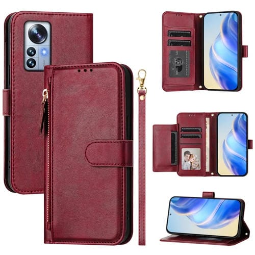 Funda de Cuero con Cremallera y Ranuras para Múltiples Tarjetas para Xiaomi 12 Pro/12S Pro (Rojo Oscuro)