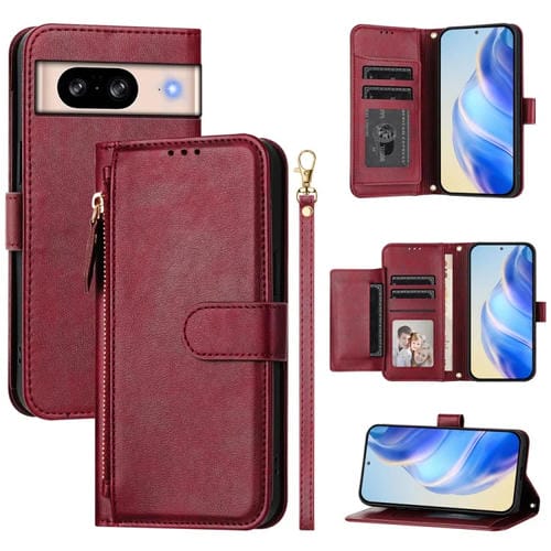 Funda de Cuero con Cremallera y Ranuras para Tarjetas para Google Pixel 8 (Rojo Oscuro)