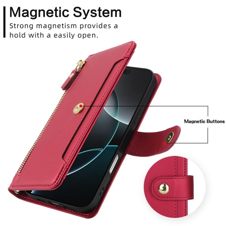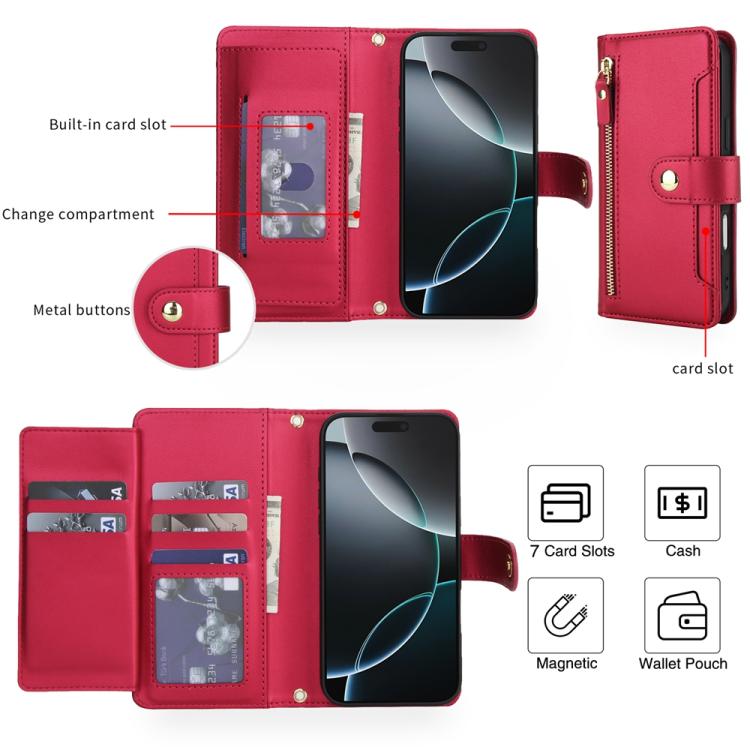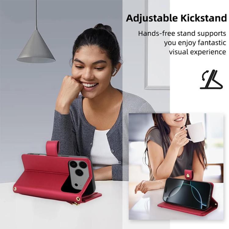 Funda de cuero con cremallera y siete ranuras para tarjetas para iPhone 17 Pro con cordón (roja)