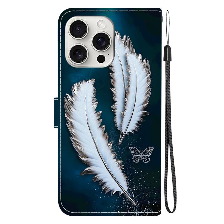 Funda de Cuero para iPhone 16 Pro Max con Dibujo de Colores y Textura de Cristal (Plumas de Mariposa Blancas)