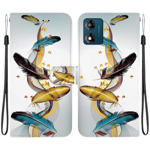 Funda de Cuero para Motorola Moto E13 con Dibujo de Colores y Textura de Cristal (Plumas de Mariposa Doradas)
