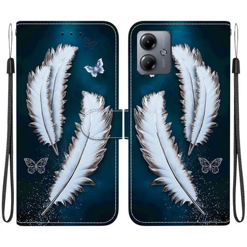 Funda de Cuero para Motorola Moto G14 con Dibujo de Colores y Textura de Cristal (Plumas de Mariposa Blancas)