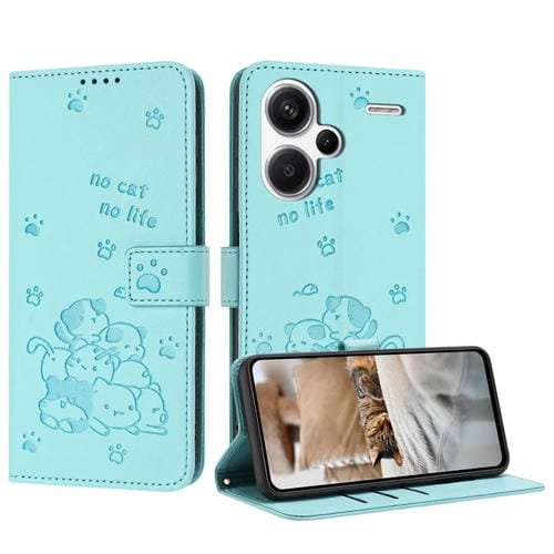 Funda de Cuero con Estampado de Gatito y Cordón para Redmi Note 13 Pro+ 5G (Verde Menta)