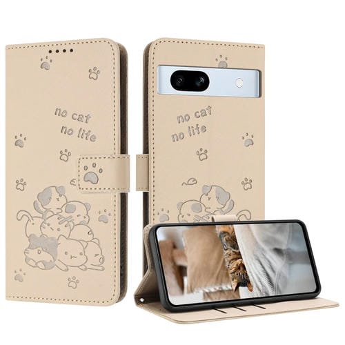 Funda de Cuero para Google Pixel 7A con Diseño de Gatito en Relieve y Cordón (Beige)