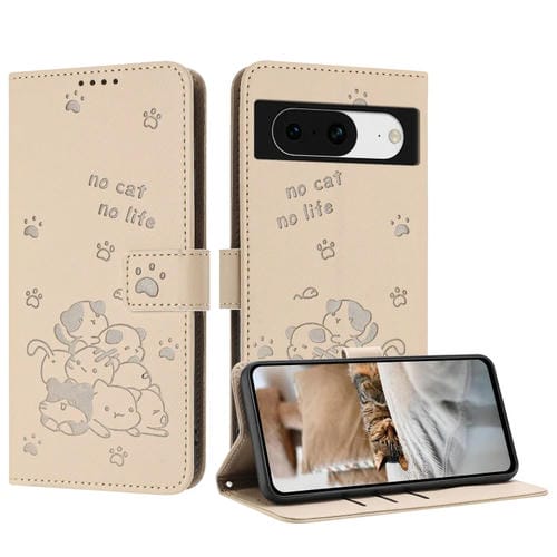Funda de Cuero para Google Pixel 8A con Diseño de Gatito en Relieve y Cordón (Beige)