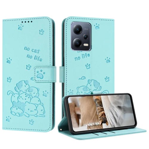 Funda de Cuero con Estampado de Gatito En Relieve para Redmi Note 12 5G con Cordón (Verde Menta)