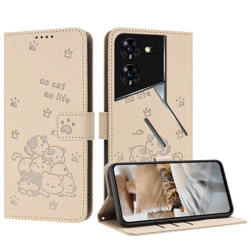 Funda de Cuero para Tecno Pova 5 Pro con Diseño de Gatito En Relieve y Cordón (Beige)