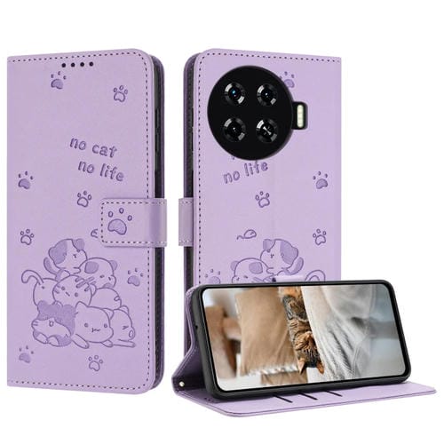 Funda de Cuero para Tecno Spark 20 Pro+ 4G con Diseño de Gatito En Relieve y Cordón (Morado)