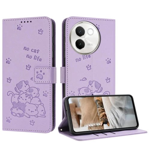 Funda de Piel con Diseño de Gatito En Relieve y Cordón para Vivo V30E 5G / V40 Lite 5G (Morado)
