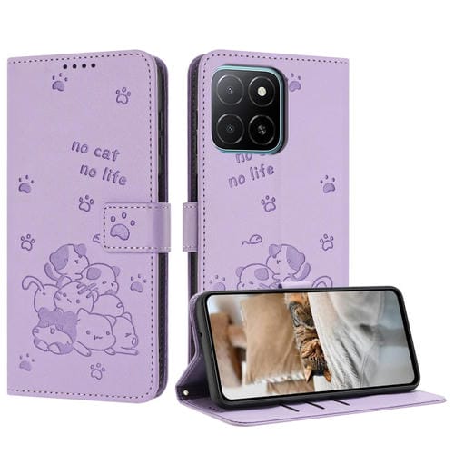 Funda de Piel para Honor X5B y X5B Plus con Diseño de Gatito en Relieve y Cordón (Morado)