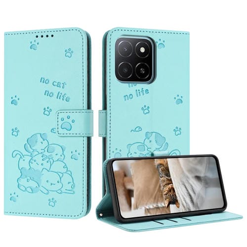Funda de Piel para Honor X5B y X5B Plus con Diseño de Gatito en Relieve y Cordón (Verde Menta)