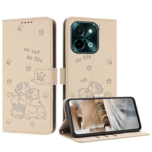 Funda de Piel con Diseño de Gatito En Relieve y Cordón para Vivo Y28 4G / Iqoo Z9X 5G (Beige)