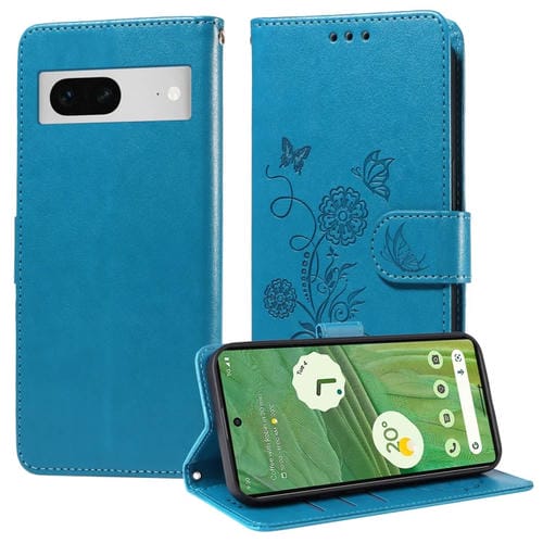 Funda de Cuero con Diseño de Mariposas y Flores en Relieve para Google Pixel 7 Pro (Azul)