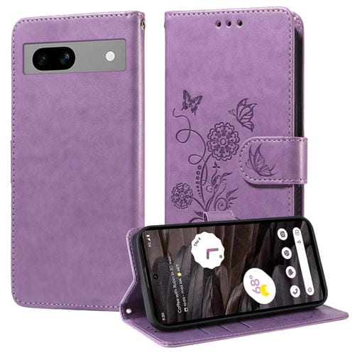 Funda de Cuero Google Pixel 7A Diseño Mariposas y Flores en Relieve (Morado)