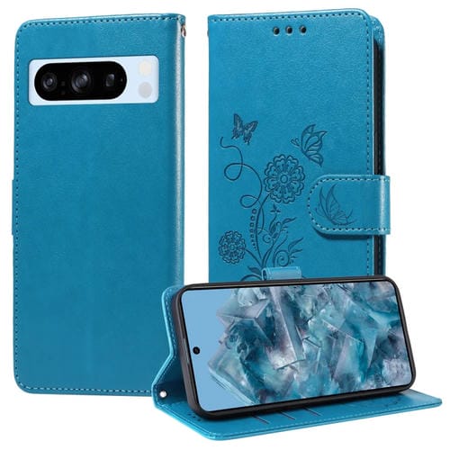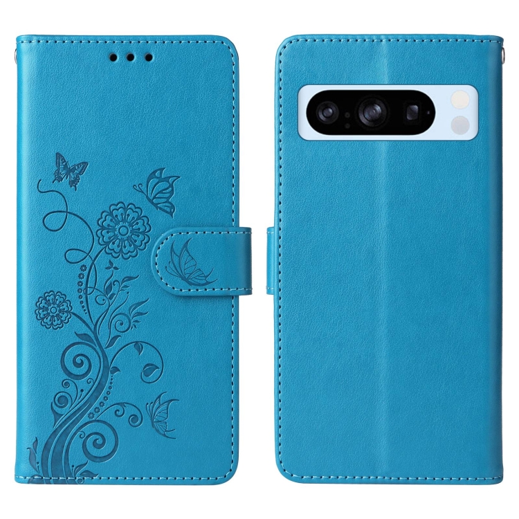 Funda de Cuero para Google Pixel 8 Pro con Diseño de Mariposas y Flores en Relieve (Azul)
