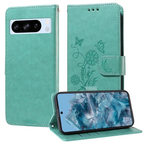 Funda de Cuero para Google Pixel 8 Pro con Diseño de Mariposas y Flores en Relieve (Verde)