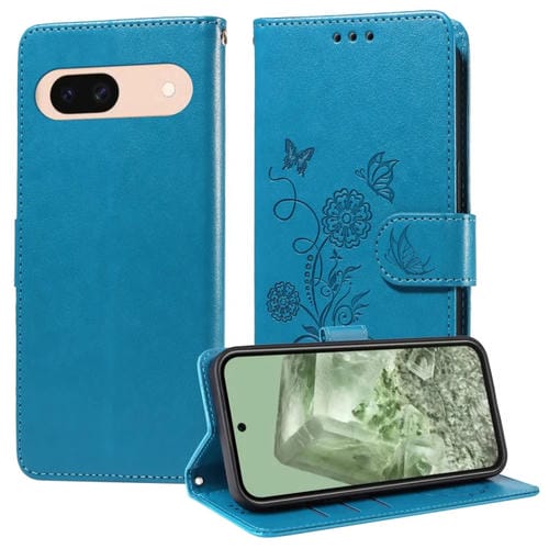 Funda de Cuero para Google Pixel 8A con Diseño de Mariposas y Flores en Relieve (Azul)