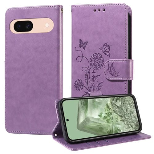 Funda de Cuero Google Pixel 8A Diseño Mariposas y Flores En Relieve (Morado)