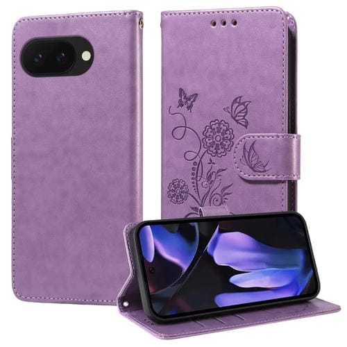 Funda de Cuero Google Pixel 9A con Diseño de Mariposas y Flores en Relieve (Morado)