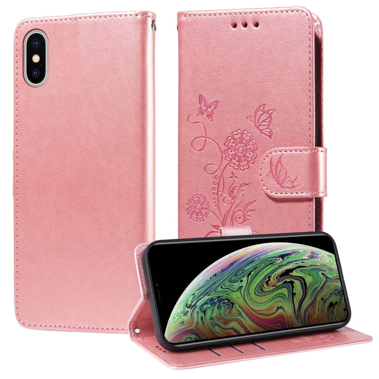 Funda de Cuero Apple iPhone X/Xs Diseño Mariposas y Flores En Relieve (Oro Rosa)