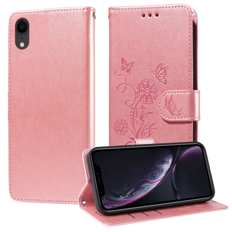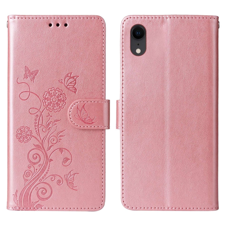 Funda de Cuero iPhone Xr Diseño Mariposas y Flores En Relieve (Oro Rosa)