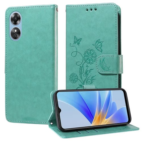 Funda de Cuero con Diseño de Mariposas y Flores En Relieve para Oppo A17 4G Global/A17K Global (Verde)