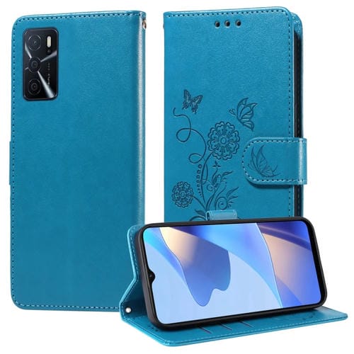 Funda de Cuero con Diseño de Mariposas y Flores En Relieve para Oppo A54 4G / A54S / A55 4G / 5G / A53S 5G (Azul)