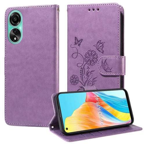 Funda de Cuero con Diseño de Mariposas y Flores En Relieve para Oppo A78 4G (Morado)