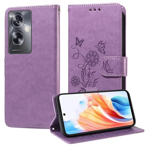 Funda de Cuero con Diseño de Mariposas y Flores En Relieve para Oppo A79 5G (Morado)